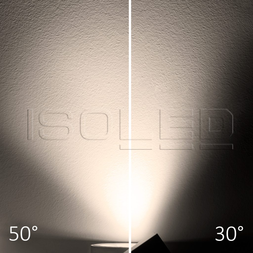 3-Phasen Schienen-Strahler fokussierbar, 36W, 30°-50°, weiß matt, 3000K, CRI92, DALI dimmbar ist ein leistungsstarker LED-Strahler, der Produkte, Räume oder architektonische Details gezielt ins Licht setzt.