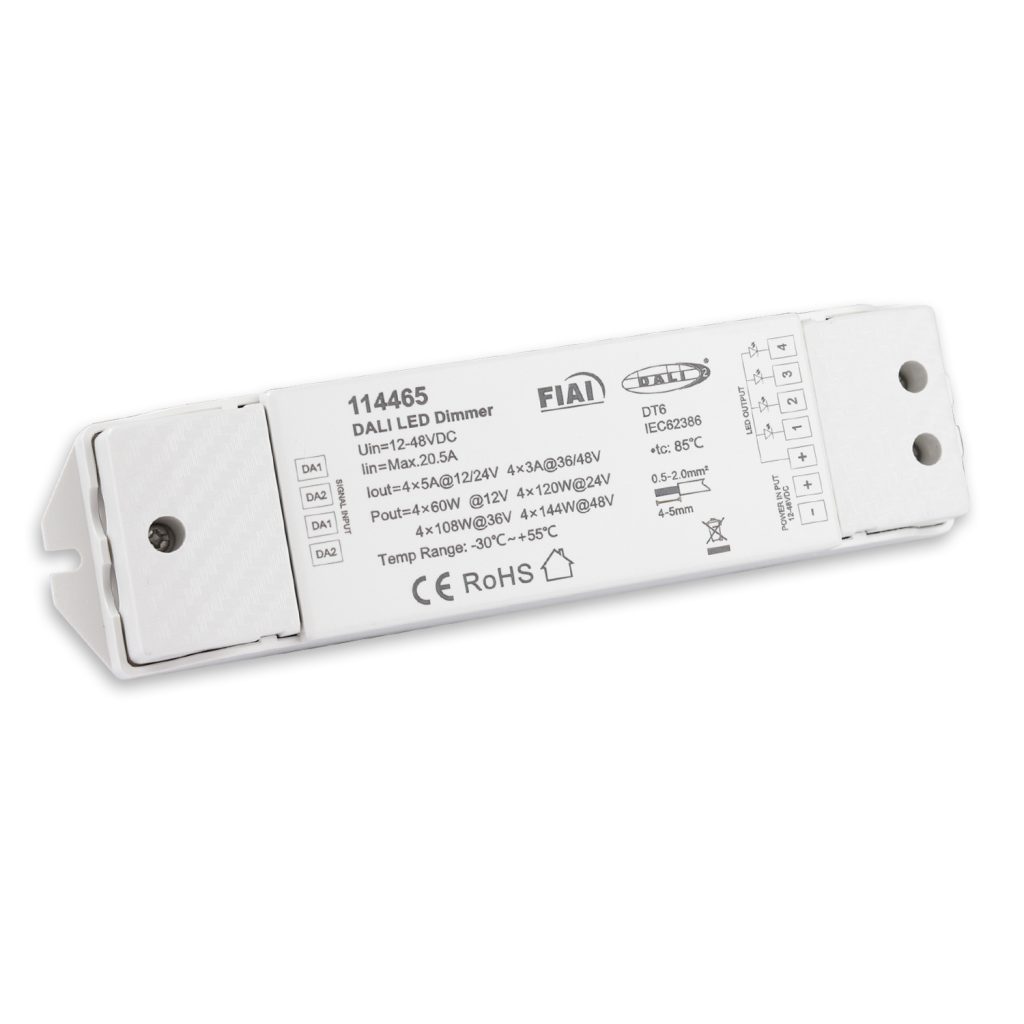 DALI DT6 4 Adressen PWM-Dimmer, 4 Kanal, 12-24V DC 4x5A, 36-48V DC 4x3A stammt aus dem professionellen ISOLED® Sortiment und eignet sich für langlebige und hochwertige Lichtprojekte.