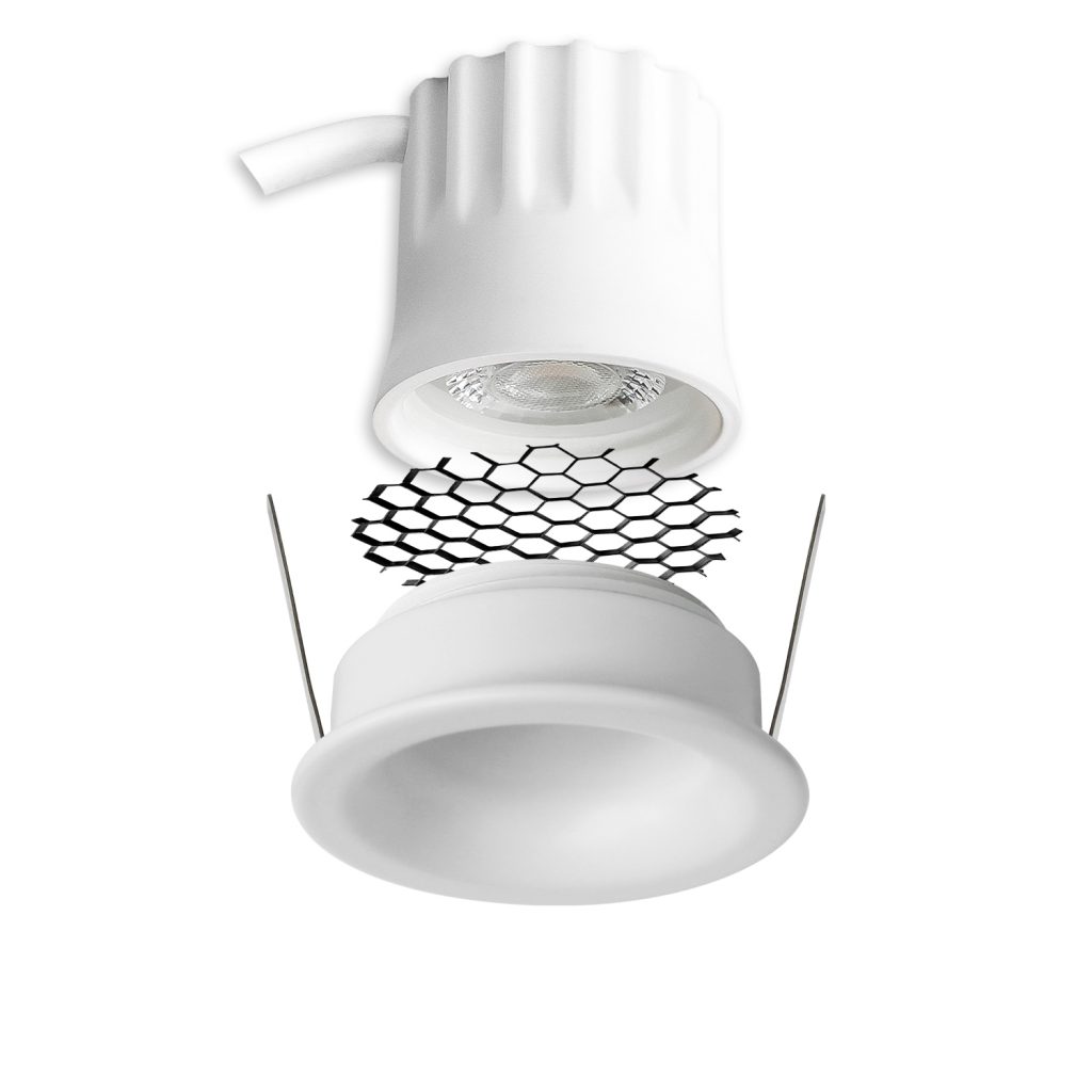 LED Einbaustrahler BACK32, weiß matt, rund, 5W, CRI90, 3000K, rückversetzt, Honeycomb, dimmbar ist ein leistungsstarker LED-Strahler, der Produkte, Räume oder architektonische Details gezielt ins Licht setzt.