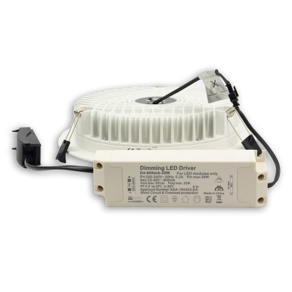 LED Downlight blendungsreduziert, 35W, rund, DN280, CRI90, Switch 3000|3500|4000K, dimmbar ist ein leistungsstarker LED-Strahler, der Produkte, Räume oder architektonische Details gezielt ins Licht setzt.