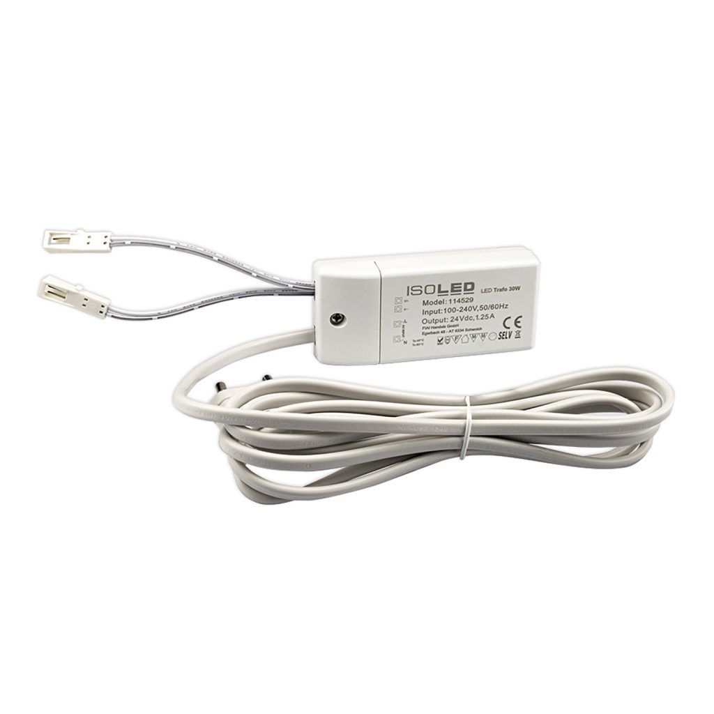 LED Trafo MiniAMP 24V/DC, 0-30W, 200cm Kabel mit Flachstecker, sekundär 2 female Buchsen ist ein hochwertiger LED-Treiber oder ein professionelles Netzteil aus dem ISOLED® Sortiment.