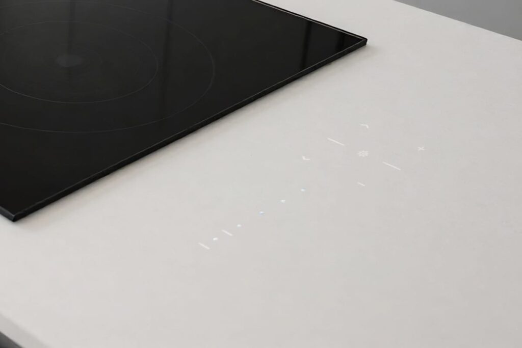 Der Loxone Touch Surface Tree verfügt über sechs Tastpunkte zur Bedienung der wichtigsten Funktionen eines Raumes. Bei Berührung einer Taste erfolgt ein Aufleuchten von LEDs und ein Klicken als akustische Bestätigung. Das Gerät kann unter einer nicht leitenden Fläche von bis zu 30mm Stärke montiert werden, die Berührungserkennung erfolgt durch das Material hindurch. Es kann Stein, Holz, Keramik oder Glas zum Einsatz kommen. Technische Details: 9 … 28 VDC 304x115x18mm / 12x4.53x0.71” (LxWxH)